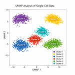 その後、次元削減やクラスタリング解析を用いて、遺伝子発現パターンが類似した細胞集団を同定します。これらの結果はUMAPやt-SNEなどの可視化手法によって表現され、細胞間の関係性や集団構造を直感的に把握することが可能です。